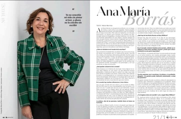 Ana María Borrás es abogada de profesión con un bagaje de treinta y cuatro años a sus espaldas. Desde pequeña siempre ha pintado, actividad artística que ha consolidado a lo largo de los años. Pero esta vez hablamos con ella para acercarnos a su faceta como escritora. Se confiesa una apasionada lectora de biografías y novelas históricas, a la vez que una ferviente admiradora del cine clásico. Aunque siempre ha sido una gran lectora, nunca hubiera imaginado que terminaría escribiendo y publicando su propia novela. En Mary Willbron. La subasta del Führer, su primera novela publicada, retrocedemos a la Europa de 1939, en los albores del comienzo de la Segunda Guerra Mundial, en una trama marcada por el destino de su protagonista, que se ve envuelta en una historia de intriga.